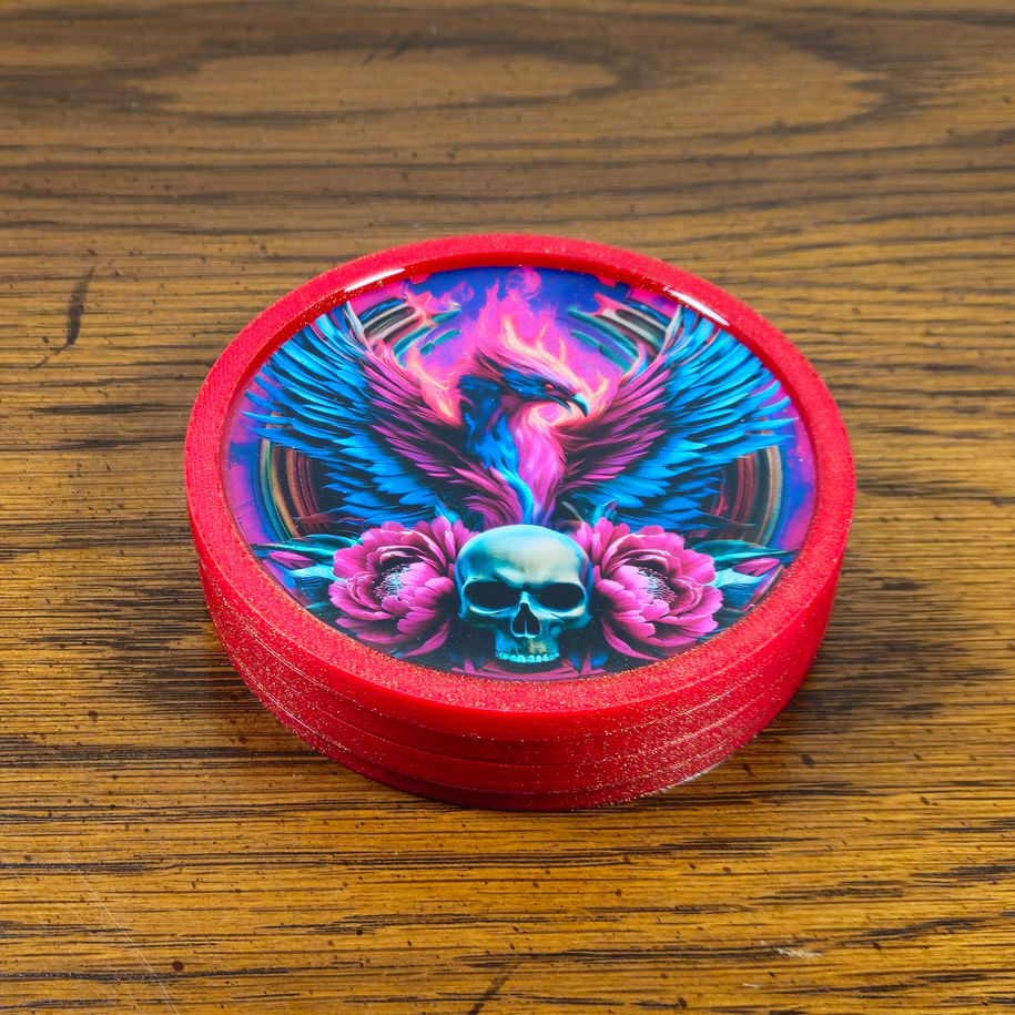 A blazing phoenix rises above a skull crowned by crimson peonies, symbolizing rebirth through destruction and the beauty born from ashes.